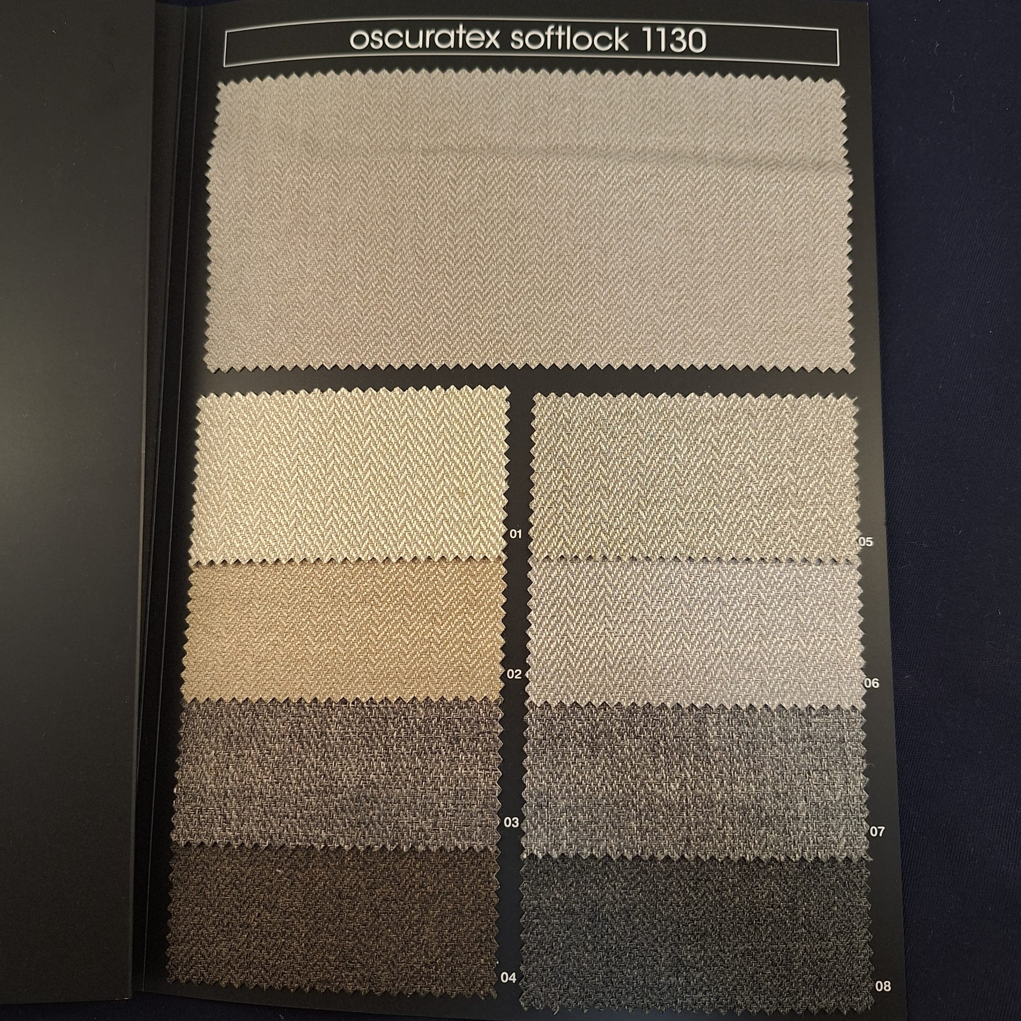 Nehořlavá blackoutová textilie s full blackout efektem a jemným V vzorem. Určena pro závěsy, rolety a paravany v komerčních a veřejných interiérech s důrazem na maximální zatemnění a profesionální vzhled.