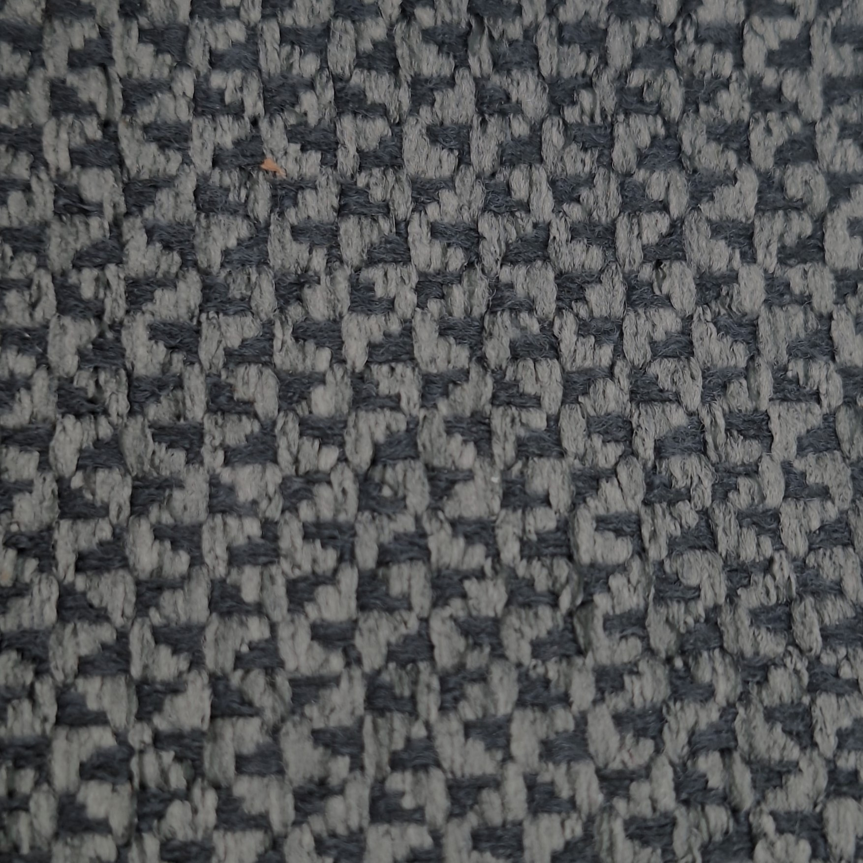 Povrch látky je prošívaný a strukturovaný, s jasně čitelným geometrickým vzorem. Vzhled je výrazný, ale stále dobře kombinovatelný s jednoduššími materiály.