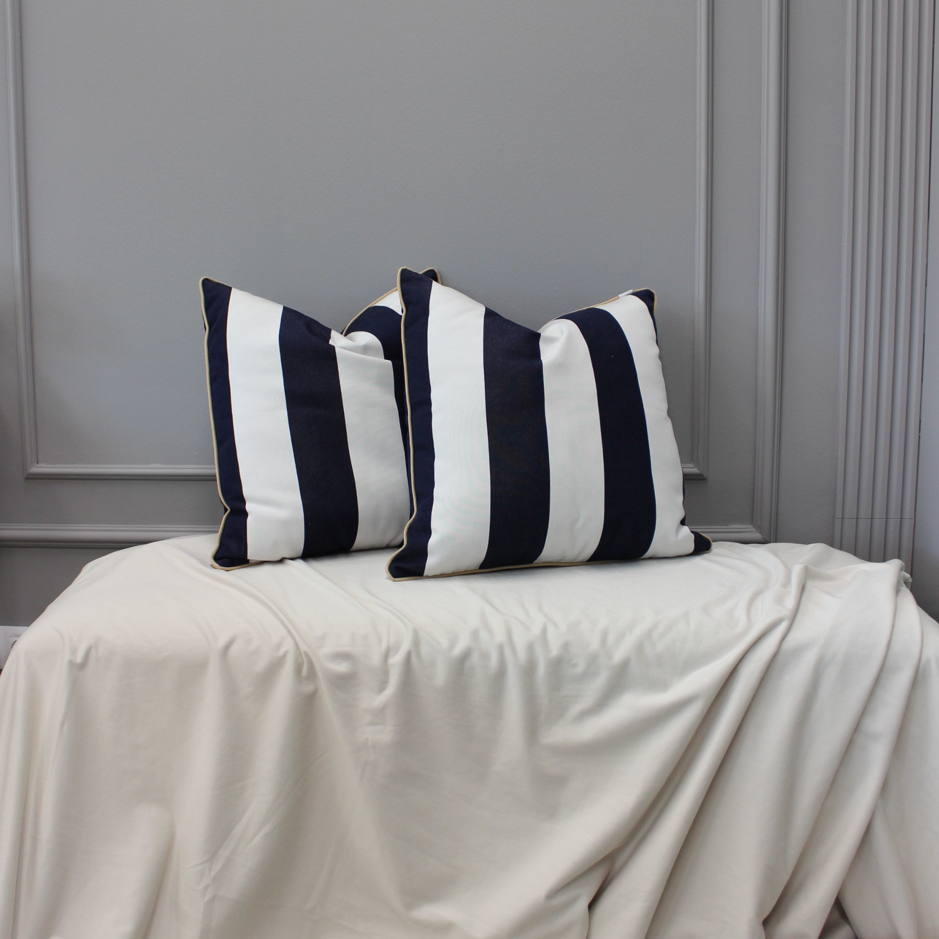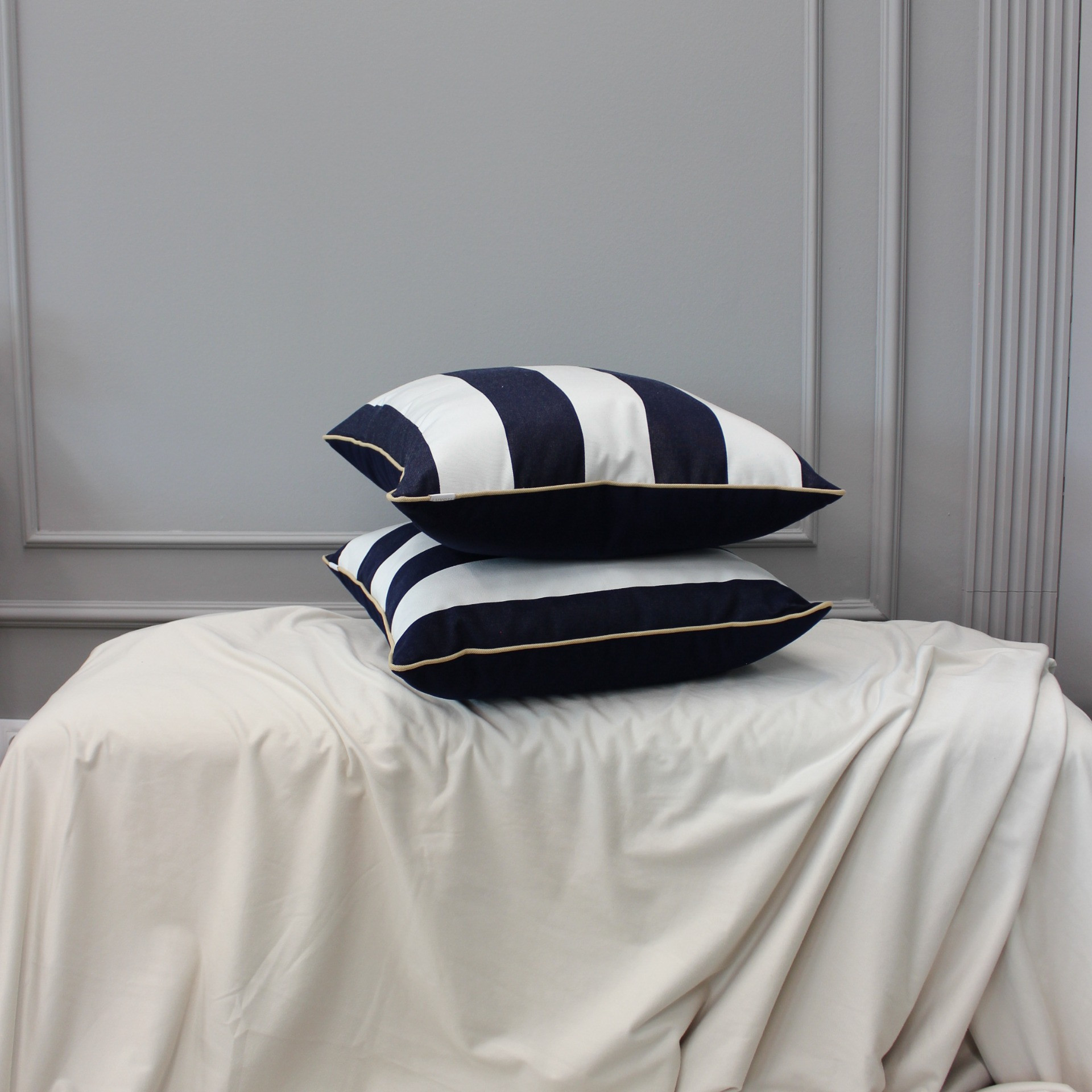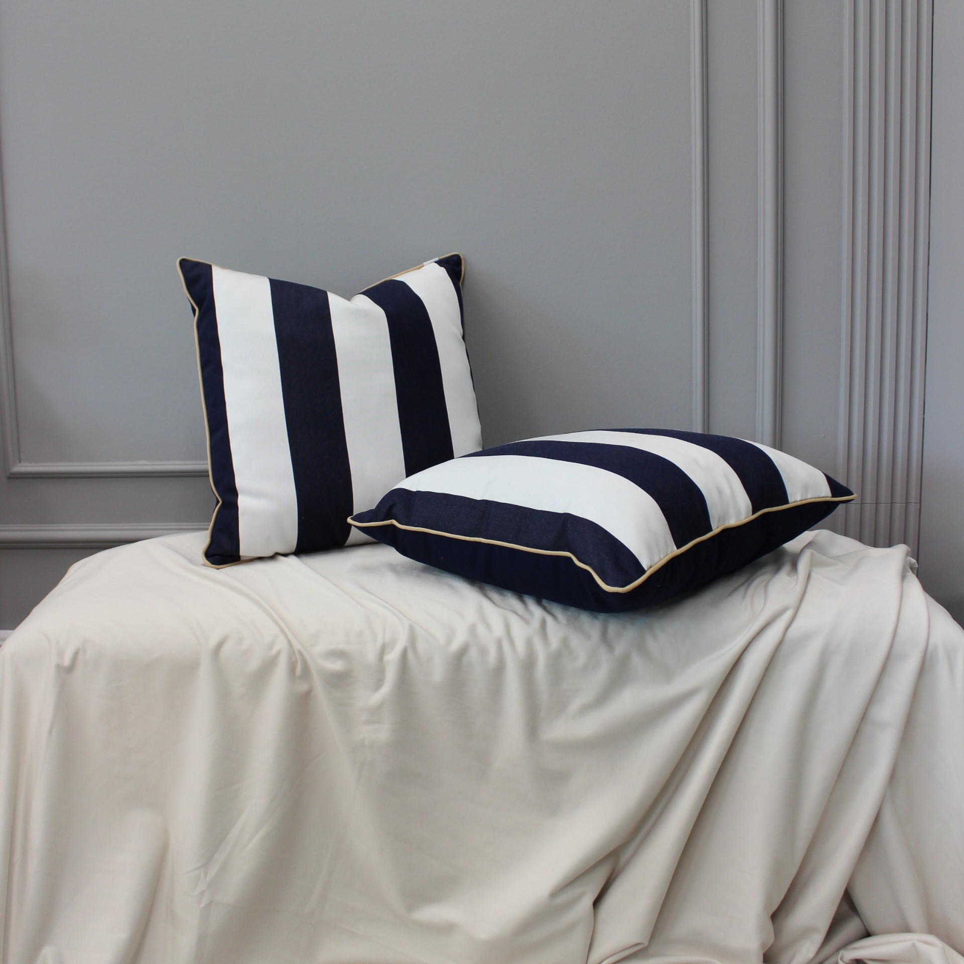 Vneste do svého domova svěží nádech přímořské atmosféry s tímto stylovým dekoračním polštářem s výrazným pruhovaným vzorem. Kombinace tmavě modré a bílé působí čistě, moderně a snadno zapadne do různých interiérů.